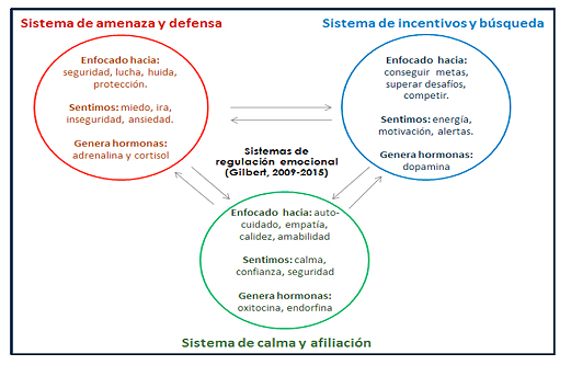 Paul Gilbert (2009, 2015), desde su CFT (Terapia centrada en la Compasión), presenta tres sistemas neurobiológicos asociados a la regulación emocional y desarrollados evolutivamente para favorecer nuestra sobre-vivencia. Cada uno de ellos está diseñado para cumplir una función determinada, pero también para trabajar juntos como un sistema en equilibrio.